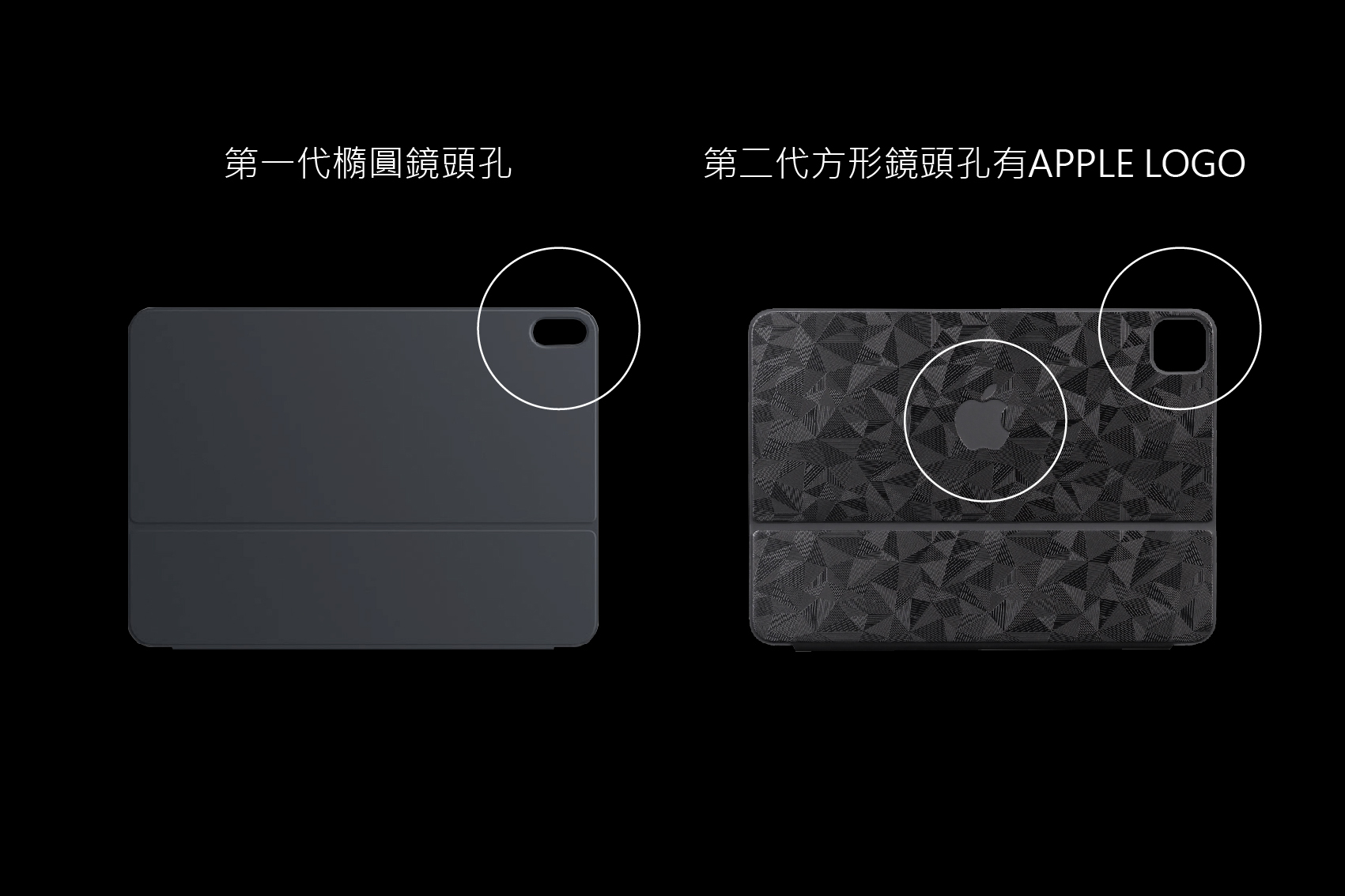 1. 第一代橢圓鏡頭孔/第二代為方形鏡頭孔有APPLE LOGO,下單請依實際鏡頭孔型式為主